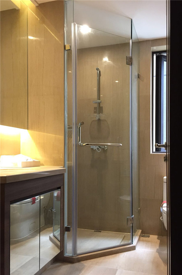 钻石型淋浴房的非标定制,充分利用卫浴间的一角,采用无框设计,营造出一个独立、舒适的淋浴空间。外侧拉手采用实用的一字型拉手,可以挂毛巾、衣服等物品。