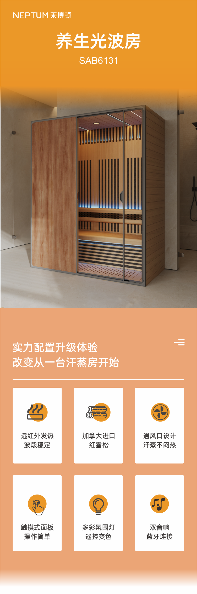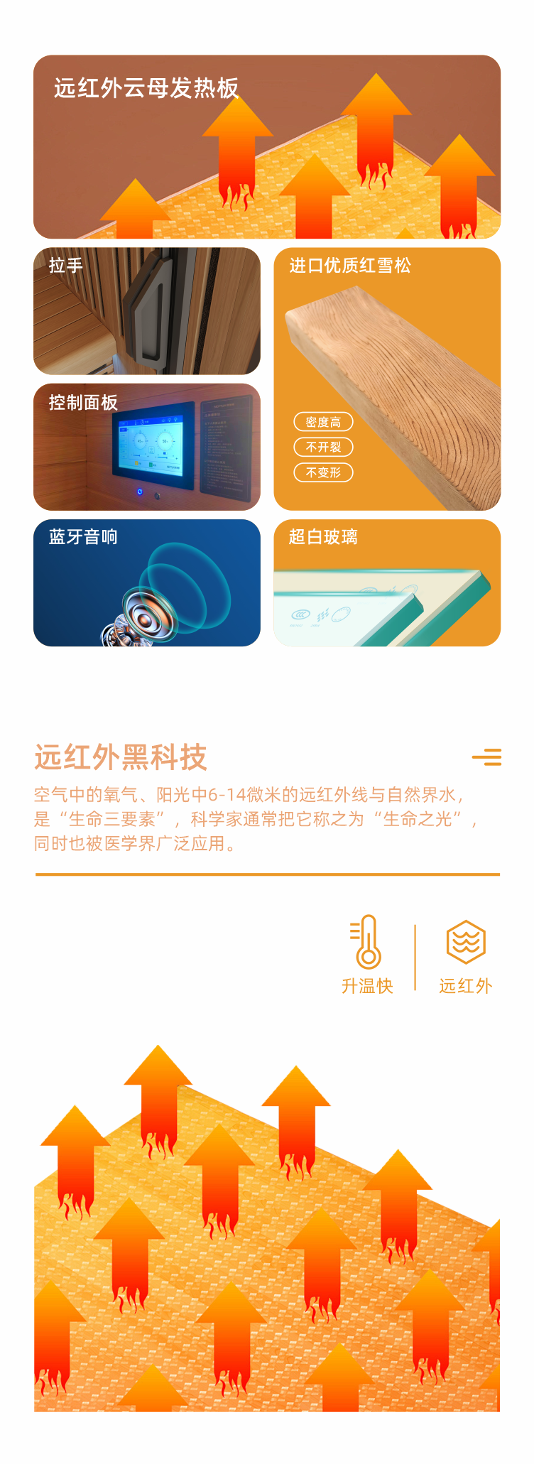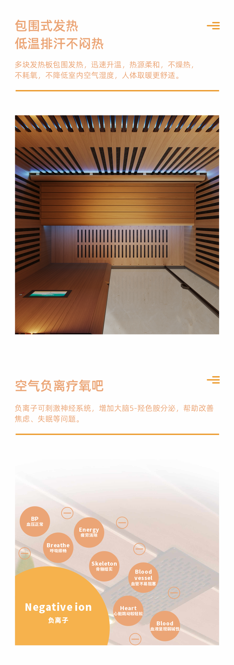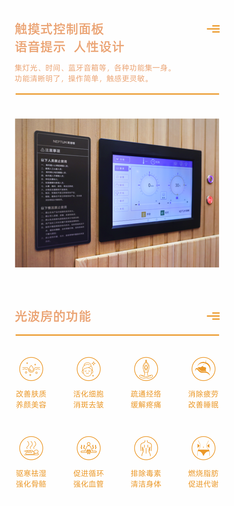 光波房颠覆了之前所以桑拿房的设计,利用红外线科技光波功能取代现代普遍的桑拿房和汗蒸房,成为新一代的养生保健标配。