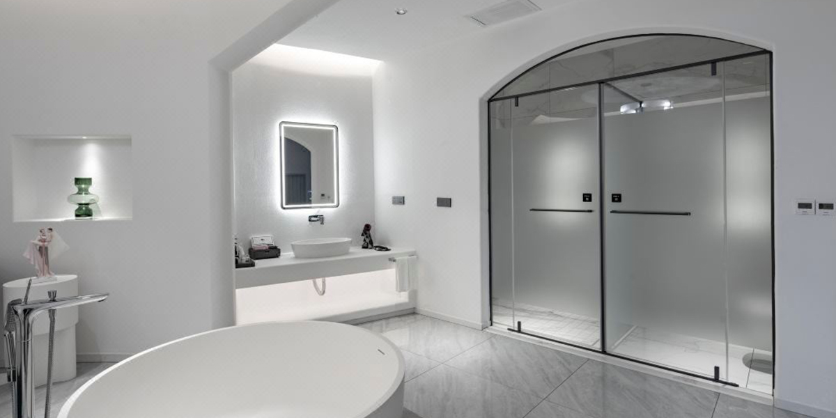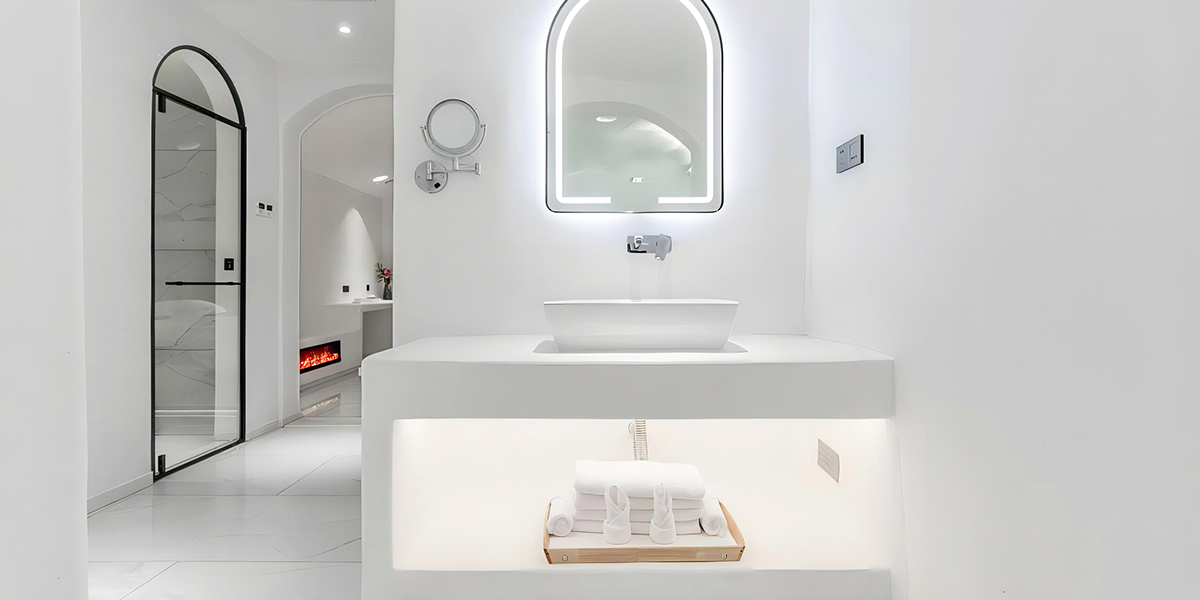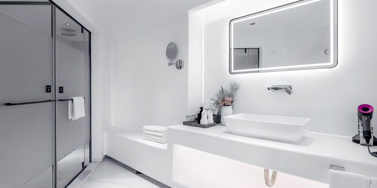 在松云半山酒店,莱博顿卫浴一切以人的体验为先,建立人与生活的视觉联系与互动,在简约中体现空间的宁静感和舒适感,以金属、玻璃材质为主的卫浴洗漱区,内外通透感跃然而出,浴室镜与艺术装饰成为室内空间的点睛之笔,实用与美感叠加,造就松弛而精致的生活方式。