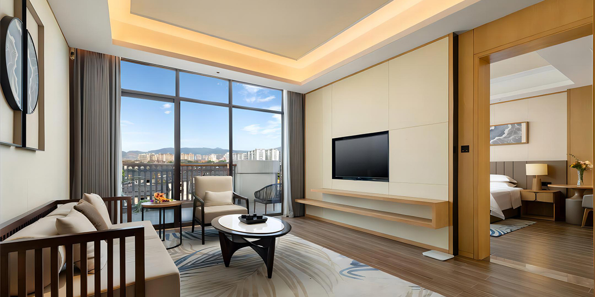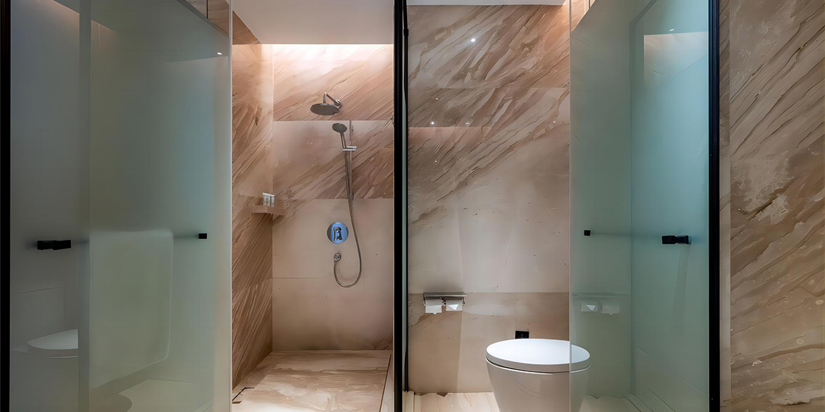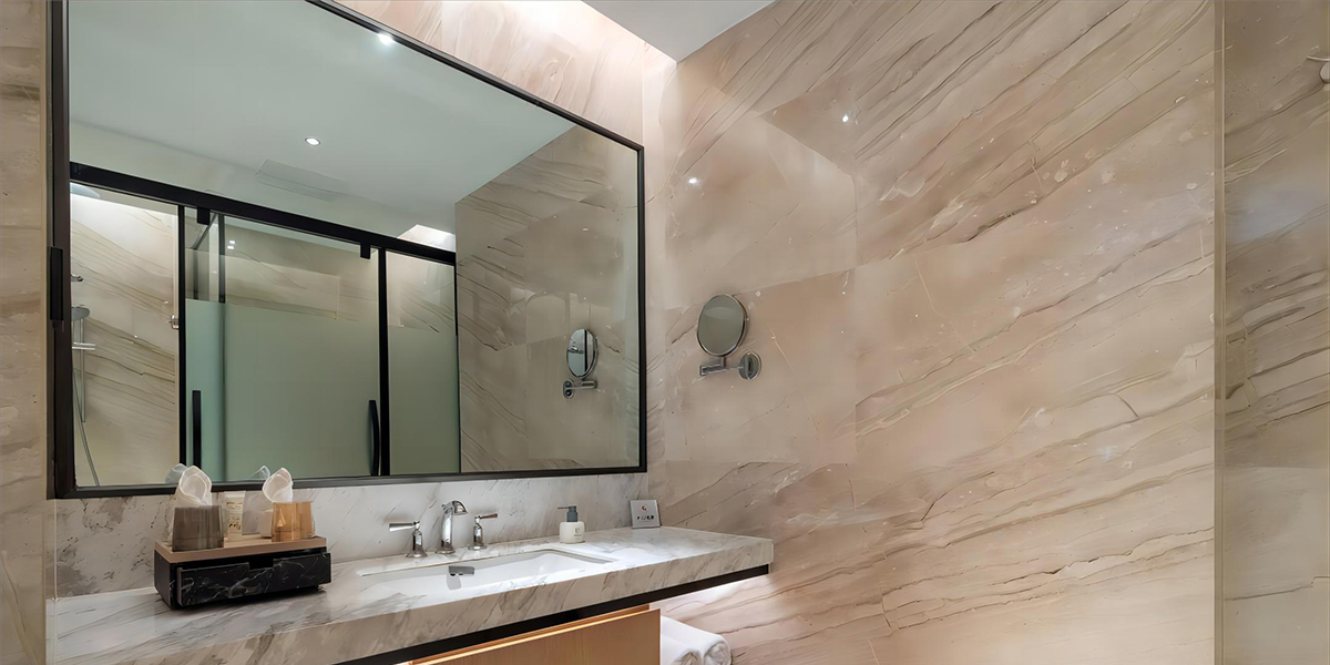 酒店的客房卫浴空间由莱博顿设计实施落地。方案采用了当下大宅卫浴空间标配的T型功淋浴房,完美实现功能区域划分,不锈钢雅黑极简边框和玻璃蒙砂搭配,尽显奢华。高配置,高颜值更加彰显了酒店的高规格。
