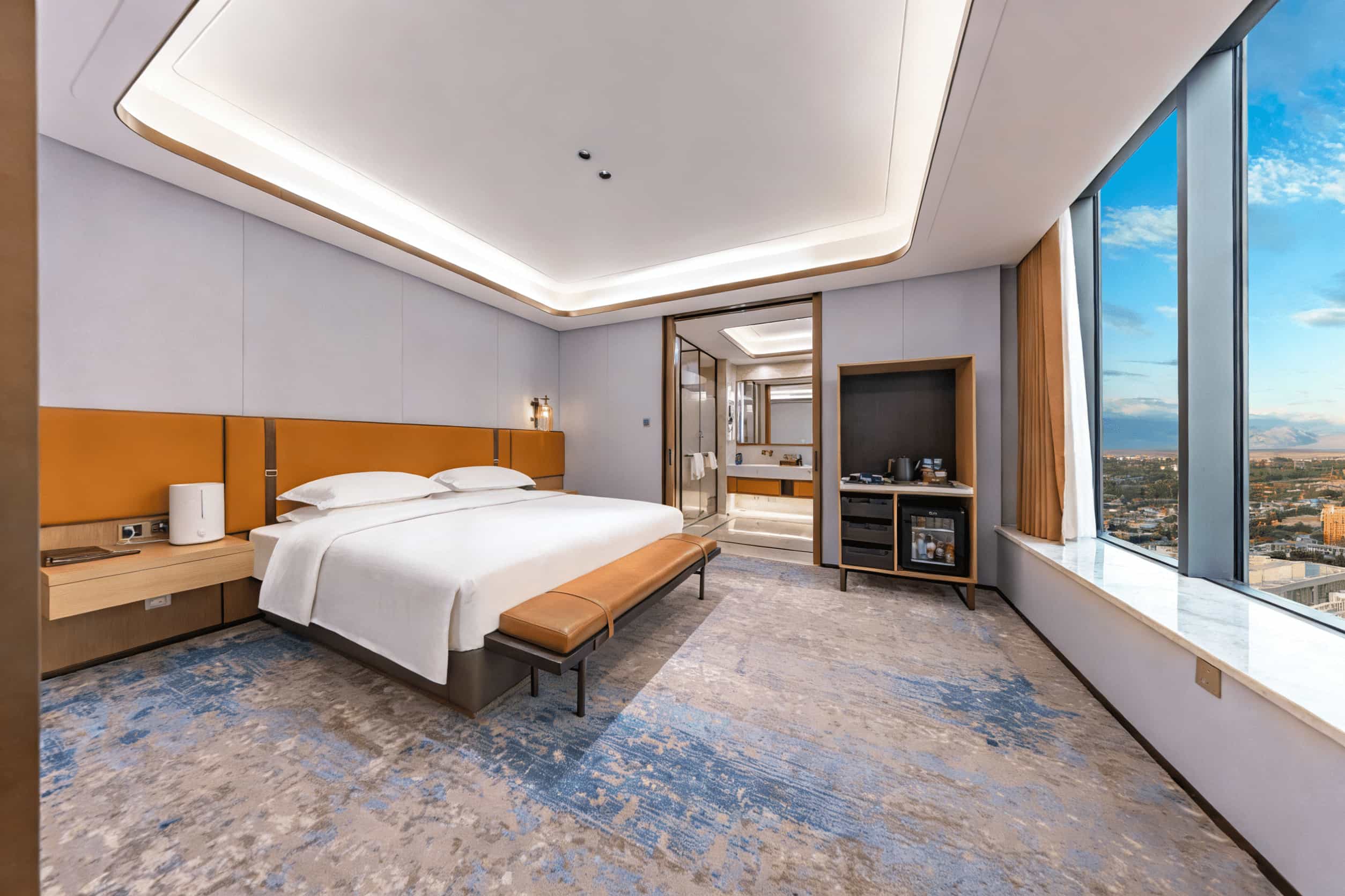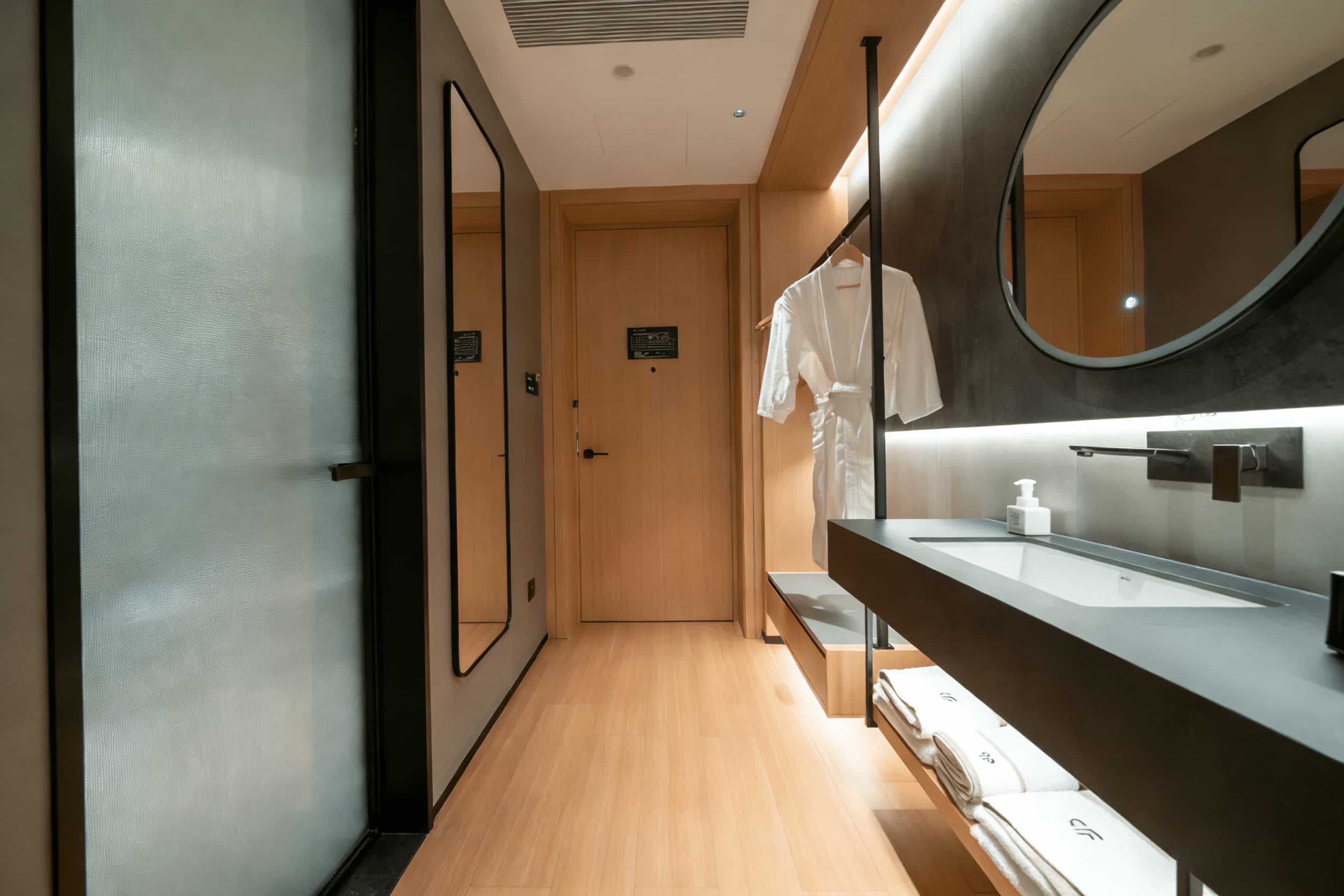 广州黄埔同派酒店是现代工业风融合摩登复古元素,如复古花砖、金属构件与皮质家具的混搭,强调“共享”与“社交”,打破传统酒店功能分区,设有专属艺术装置(如貔貅“派派”),增添趣味与打卡点。 客房采用现代简约风格,注重实用与舒适。普遍采用全景落地窗以增加空间通透感,浴室多为干湿分离设计,色调以白、灰为主,显得干净利落。