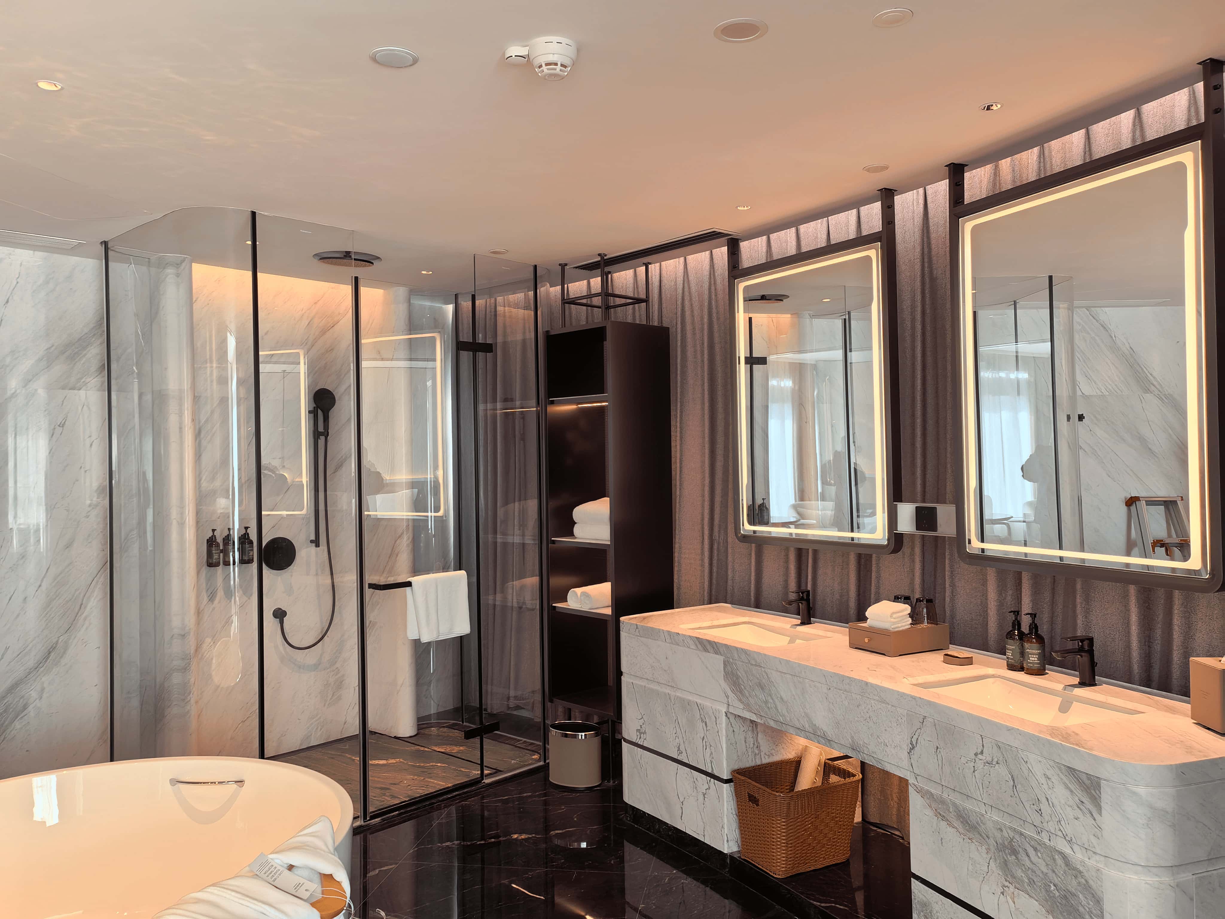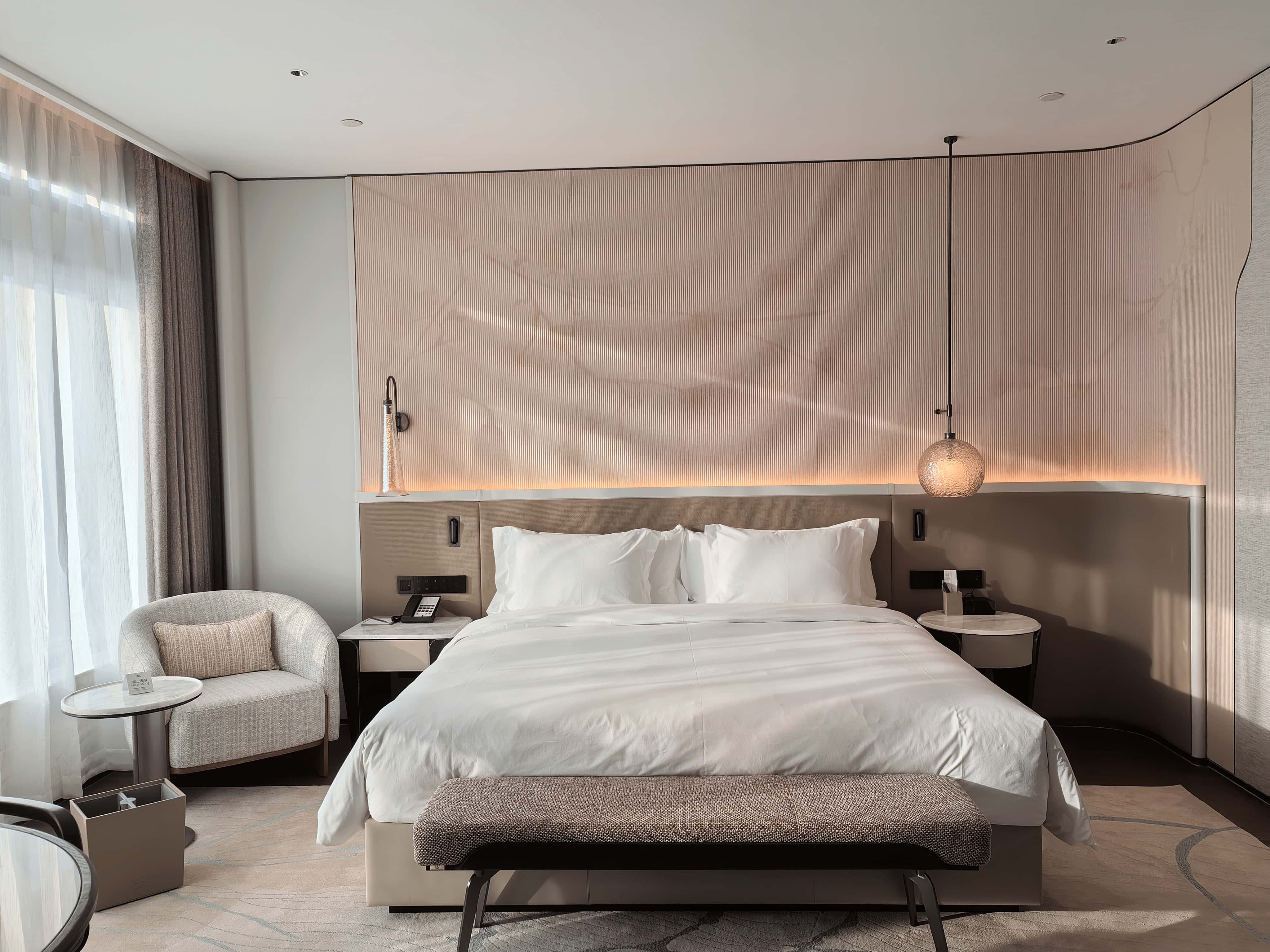 客房设计:客房注重实用与舒适,采用开放式衣帽间、干湿分离卫浴(配独立浴缸)及灵活分区设计。部分客房配备高低双工作台和人體工学椅,方便商务客人工作。